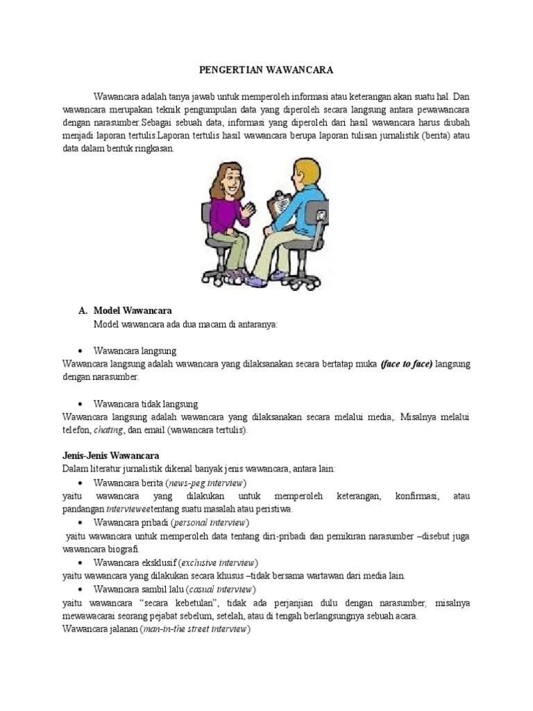 Saat melakukan wawancara ini, seseorang pelamar kerja akan diwawancarai oleh seorang pewawancara. Cari jawaban kelas 4 sd . Wawancara adalah suatu interaksi antara reporter dengan narasumber yang bertujuan mendapatkan informasi dan penjelasan mengenai topik yang . Dalam wawancara terpimpin, pewawancara sudah dibekali dengan daftar pertanyaan yang lengkap dan terinci. Wawancara adalah percakapan antara dua orang atau lebih dan berlangsung antara narasumber dan pewawancara.
